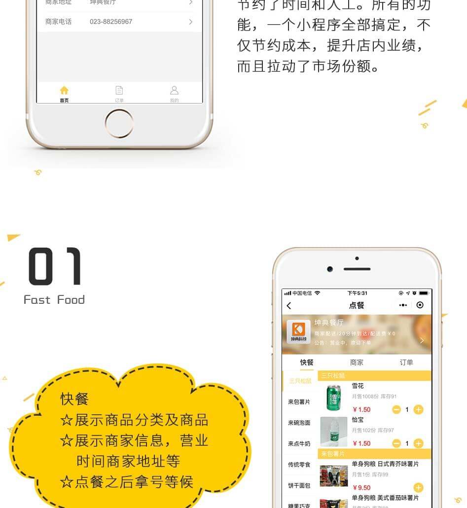 单店外卖、多店营销、商家展示、商家定位、订单提醒、模板消息、扫码点餐、预约桌位、预定菜品、扫码付款、在线点餐、分销系统、排队取号、支付收银、商家入驻、打印机支持、会员卡、优惠券功能、报表统计、积分商城、余额充值、店铺评论